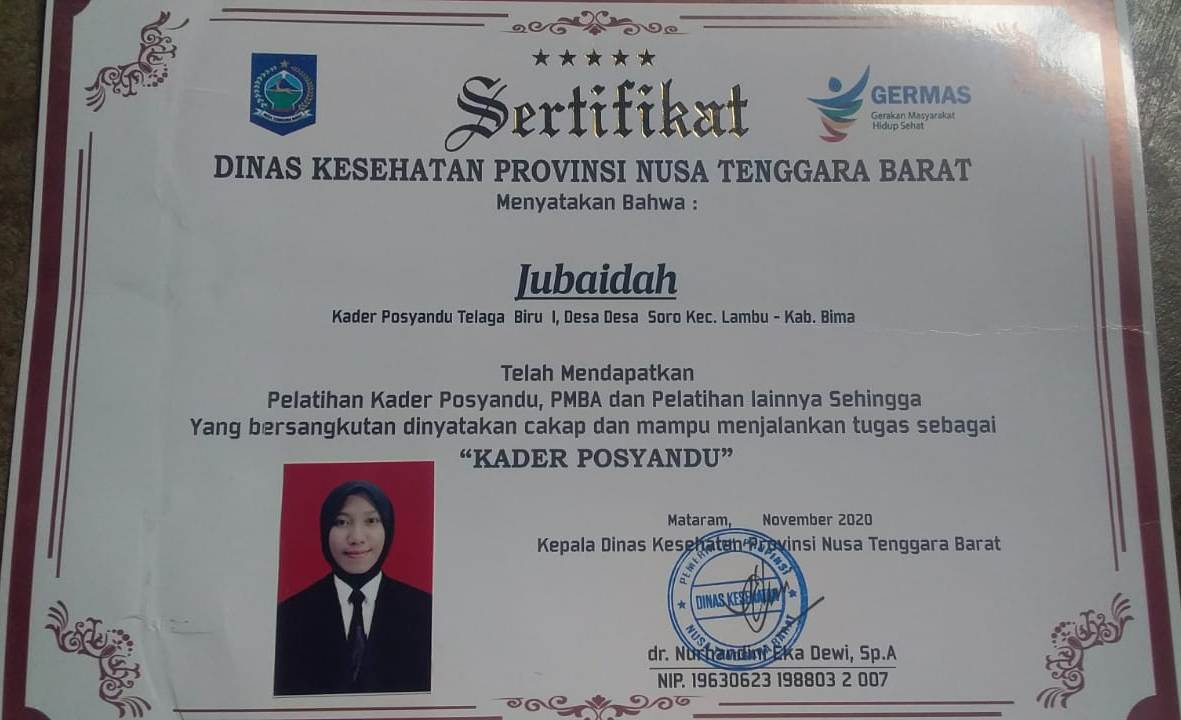 Soro-Lambu. Dinas Kesehatan Propinsi Nusa Tenggara Barat Dr. Nurhandini Eka Dewi, Sp.A berikan Setifikat kepada seluruh kader Posyandu Desa Soro Kecamatan Lambu Kabupaten Bima. Serah terima sertifikat dilakukan di Aula Kantor Desa Soro yang diwakilkan oleh Kades Soro Abd. Hadi Abdollah bersama Kepala Puskesmas Kecamatan Lambu. Selasa, 10/03/2021